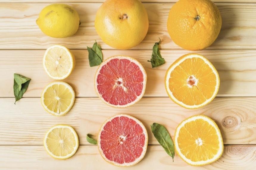 фрукты и листочки на деревянном фоне